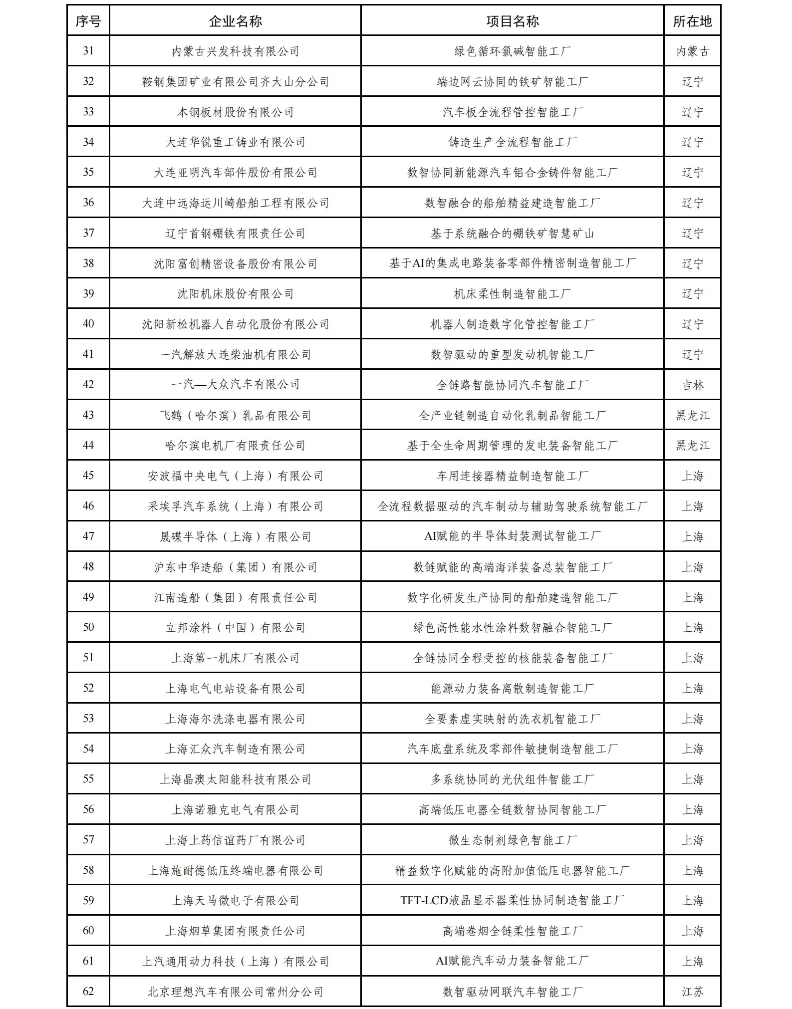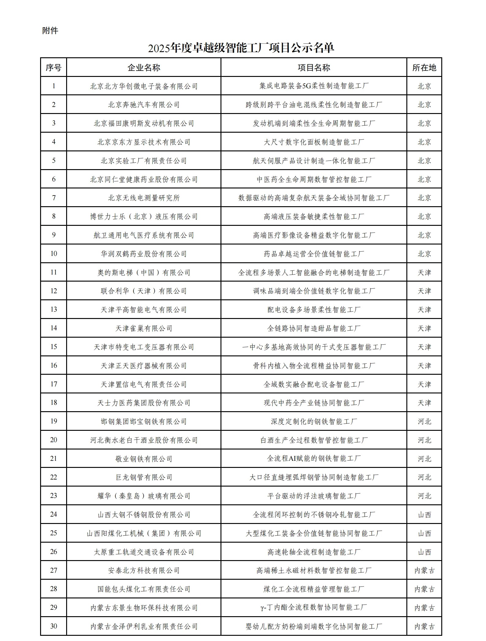 根据《关于开展2025年度智能工厂梯度培育行动的通知》(工信厅联通装函〔2025〕251号),现将拟入选的2025年度卓越级智能工厂项目名单进行公示,请社会各界监督。如有异议,请在公示期内将书面意见反馈至工业和信息化部装备工业一司(智能制造处)。