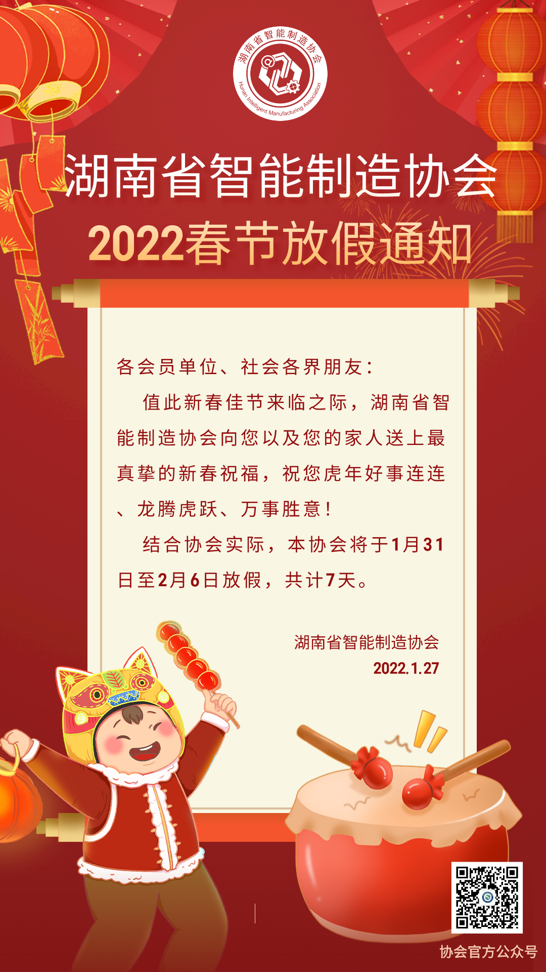 湖南省智能制造协会春节放假通知