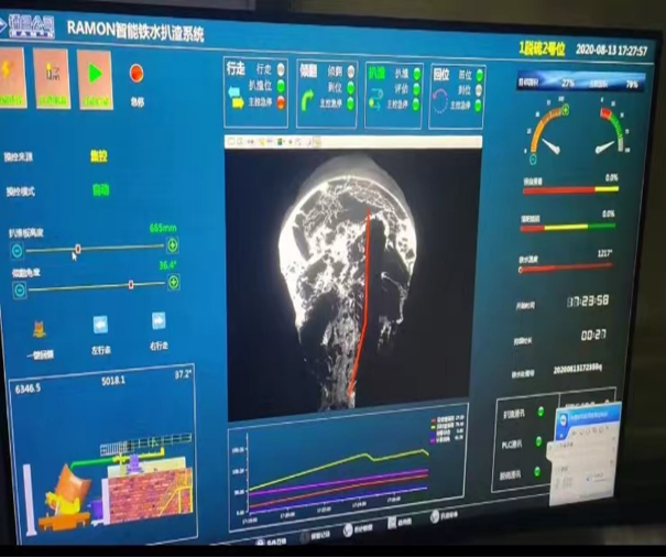 本项目在现有技术所呈现的环境下,改变了传统的技术缺陷,通过图像采集和智能分析,确定渣面分布及评估情况,自动控制扒渣机扒渣,从而提高冶炼洁净度和产品质量,减少人为因素带来的质量不稳定情况,杜绝该岗位人身安全事故。同时可以根据现场的实时信息,通过完整的数据记录功能,且与二级系统的信息进行交互,能在环节结束后,智能截取完成的铁水液面图像,以及整个的过程录像,分析钢水的情况,保证钢水质量的稳定。