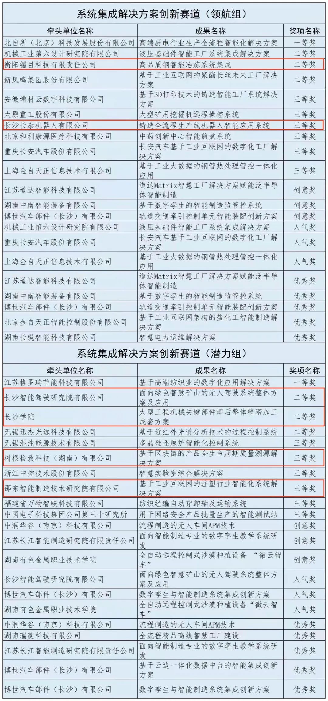 11月17日-18日,第二届智能制造创新大赛全国总决赛在北京、南京两地成功举办,最终评选出各赛道各小组一等奖1名、二等奖3名、三等奖6名、创意奖3名、人气奖3名和优秀奖5名。其中,系统集成解决方案创新赛道,湖南有6个参赛作品获评二三等奖,获评创意奖作品3个、获评人气奖作品3个、获评优秀奖作品6个。(名单如下)